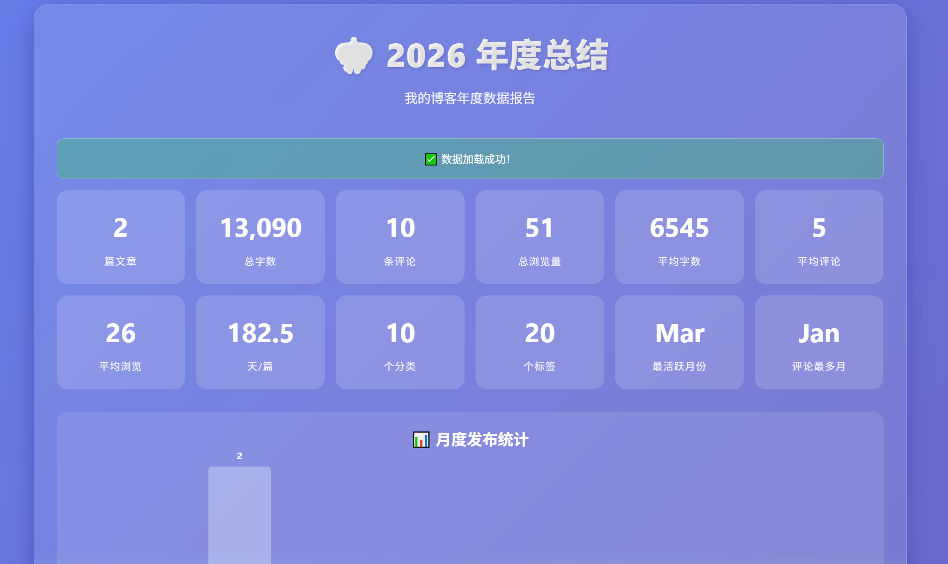 Typecho 年终总结独立页面使用教程 这个精心设计的 PHP 文件可以为您的 Typecho 博客生成一个炫酷的年度数据报告页面。它包含了文章统计、评论分析、浏览量统计、月度发布图表、热门文章、活跃评论者等多种数据可视化功能,并且拥有现代化的响应式设计,在手机和电脑上都有出色的显示效果。✨ 功能亮点数据概览:直观展示年度文章数、总字数、评论数、浏览量等核心数据。月度图表:以柱状图形式展示每月的...